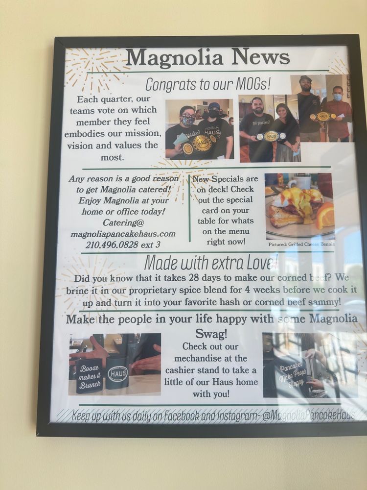Introducing Magnolia Pancake, a trendy and touristy spot in Schertz, TX, offering delectable desserts, coffee, and brunch. With a wide range of menu options, including German Apple Pancakes and Texas Peach Pecan Waffles, Magnolia Pancake has something for everyone. Customers rave about the delicious food, welcoming atmosphere, and attentive service. The menu caters to various dietary needs, and the restaurant is wheelchair accessible and dog-friendly. The option for online check-in saves time and ensures a smoother dining experience. Magnolia Pancake is a must-visit for those craving a satisfying breakfast or brunch. A top choice for groups and families, this establishment provides an unforgettable dining experience with unique flavors and influences.