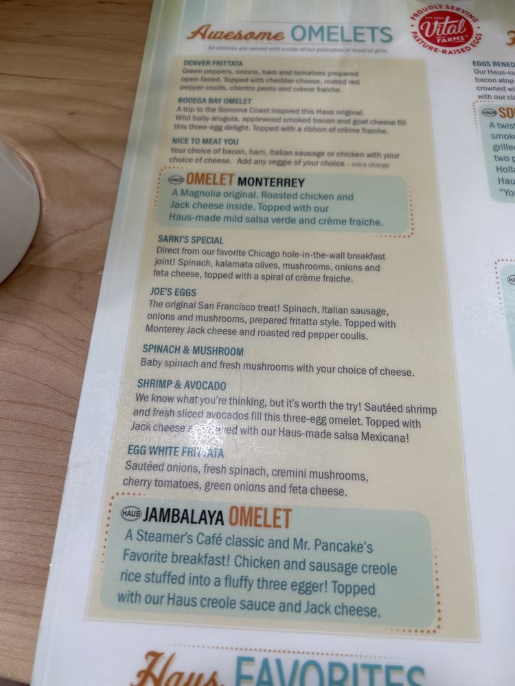 A Steamers Cafe Classic and Mr. Pancakes Favorite Breakfast!! Chicken and Sausage Accented Creole Jambalaya Rice with Jack Cheese in a Fluffy Three-egger. Topped with Our Mild Creole Sauce!
